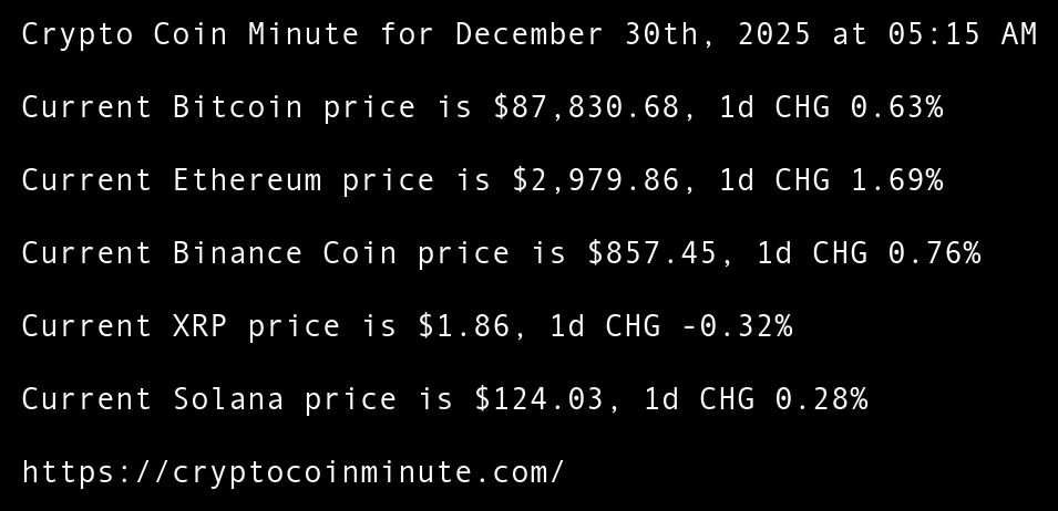 Crypto Coin Minute for December 30th, 2025 at 05:15 AM Pacific Time.