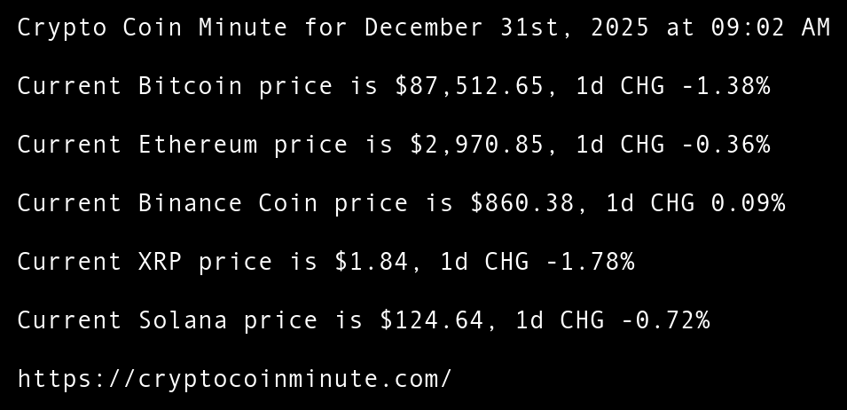 Crypto Coin Minute for December 31st, 2025 at 09:02 AM Pacific Time.