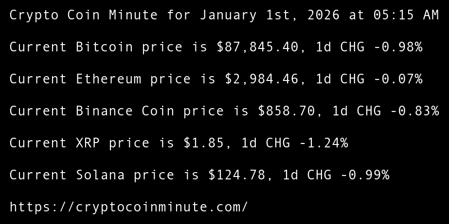 Crypto Coin Minute for January 1st, 2026 at 05:15 AM Pacific Time.