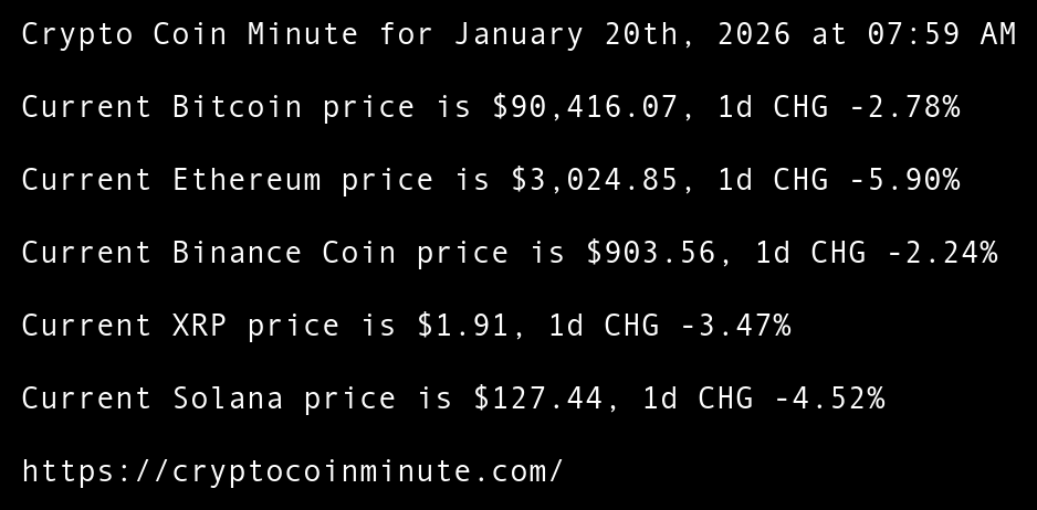 Crypto Coin Minute for January 20th, 2026 at 07:59 AM Pacific Time.