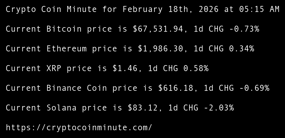 Crypto Coin Minute for February 18th, 2026 at 05:15 AM Pacific Time.