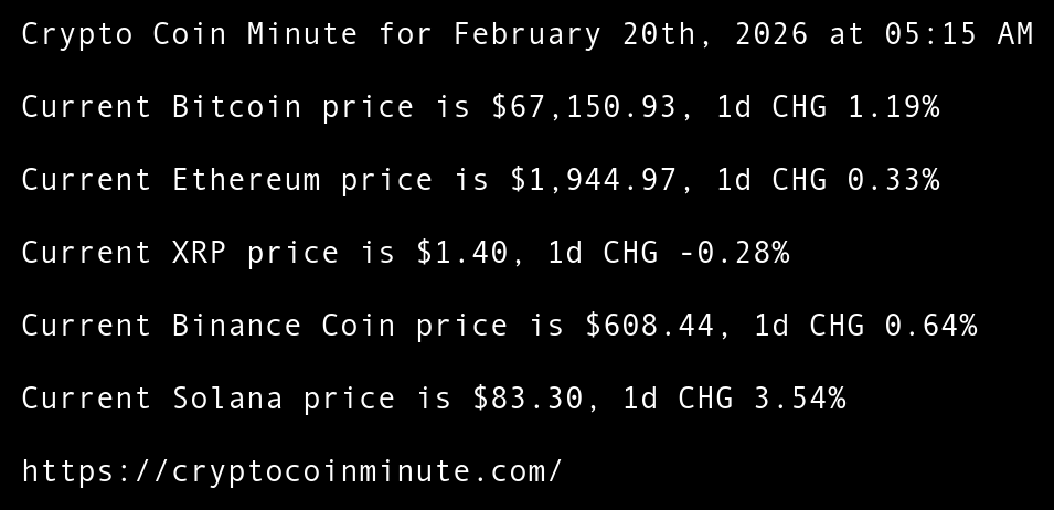 Crypto Coin Minute for February 20th, 2026 at 05:15 AM Pacific Time.