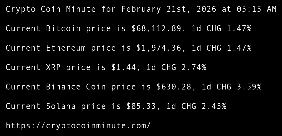 Crypto Coin Minute for February 21st, 2026 at 05:15 AM Pacific Time.