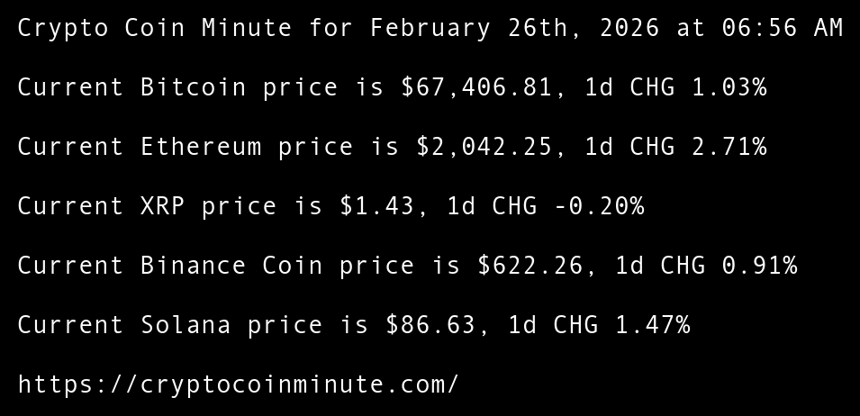 Crypto Coin Minute for February 26th, 2026 at 06:56 AM Pacific Time.