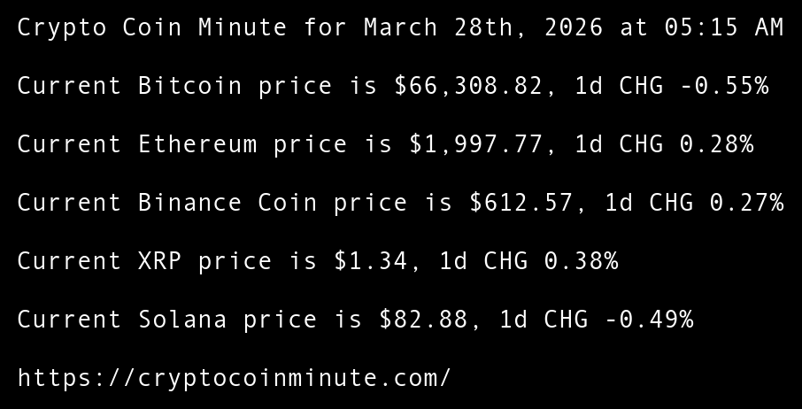 Crypto Coin Minute for March 28th, 2026 at 05:15 AM Pacific Time.