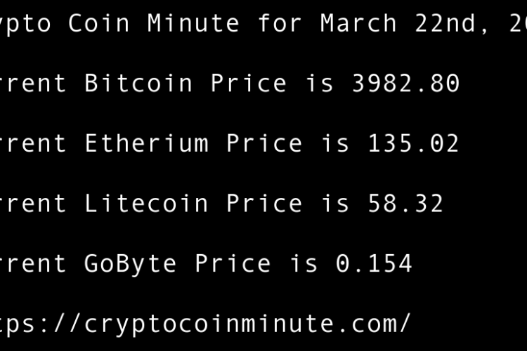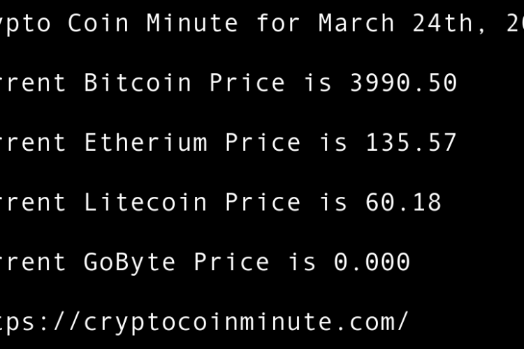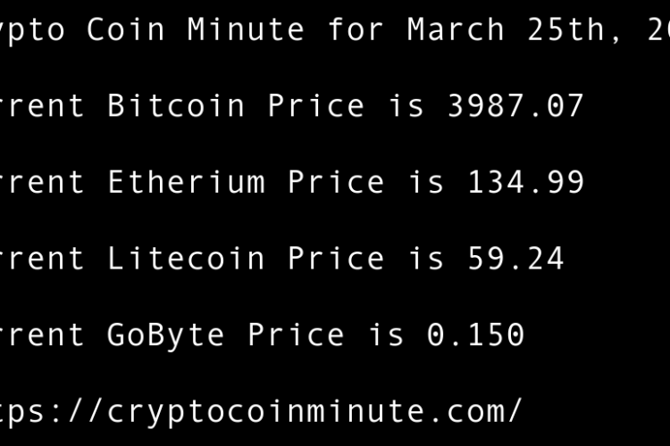 Current Bitcoin Price is 3987.07 Current Etherium Price is 134.99 Current Litecoin Price is 59.24 Current GoByte Price is 0.150
