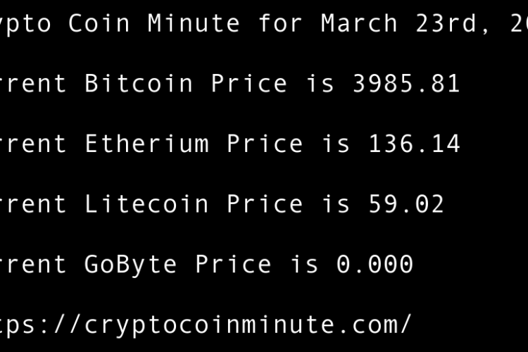 Current Bitcoin Price is 3985.81 Current Etherium Price is 136.14 Current Litecoin Price is 59.02 Current GoByte Price is 0.000