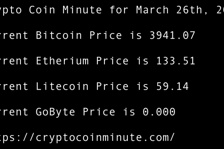 Current Bitcoin Price is 3941.07 Current Etherium Price is 133.51 Current Litecoin Price is 59.14 Current GoByte Price is 0.000