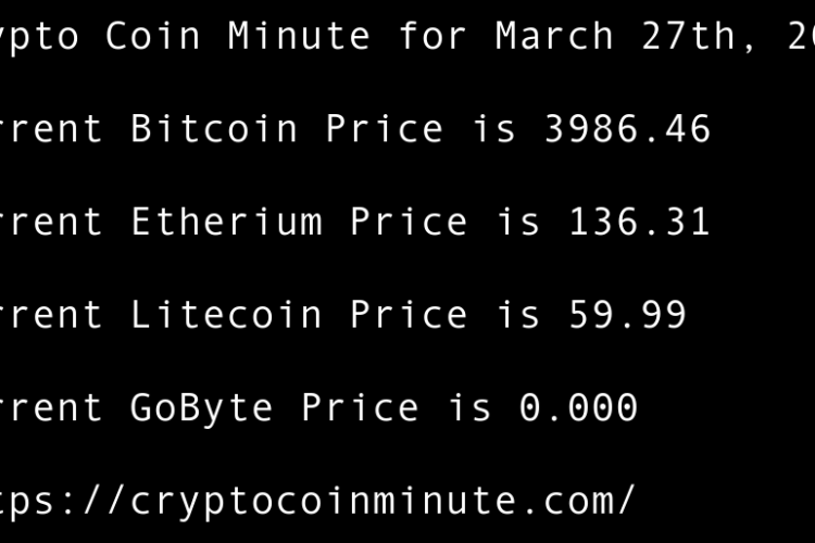 Current Bitcoin Price is 3986.46 Current Etherium Price is 136.31 Current Litecoin Price is 59.99 Current GoByte Price is 0.000