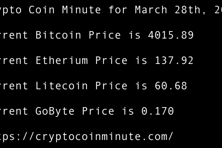 Current Bitcoin Price is 4015.89 Current Etherium Price is 137.92 Current Litecoin Price is 60.68 Current GoByte Price is 0.170