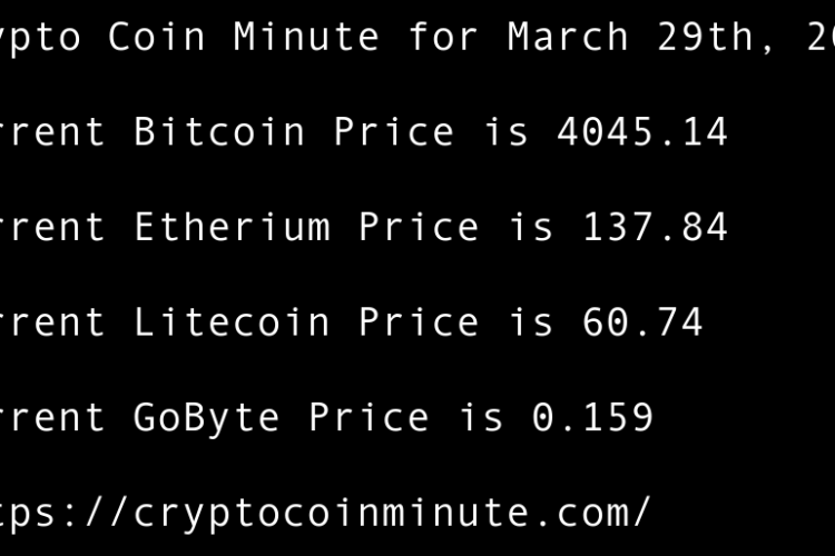 Current Bitcoin Price is 4045.14 Current Etherium Price is 137.84 Current Litecoin Price is 60.74 Current GoByte Price is 0.159