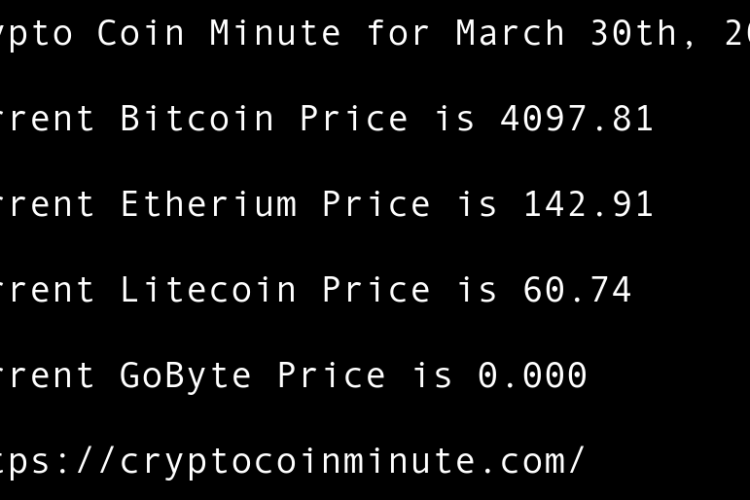 Current Bitcoin Price is 4097.81 Current Etherium Price is 142.91 Current Litecoin Price is 60.74 Current GoByte Price is 0.000