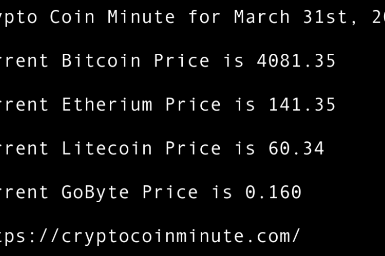 Current Bitcoin Price is 4081.35 Current Etherium Price is 141.35 Current Litecoin Price is 60.34 Current GoByte Price is 0.160
