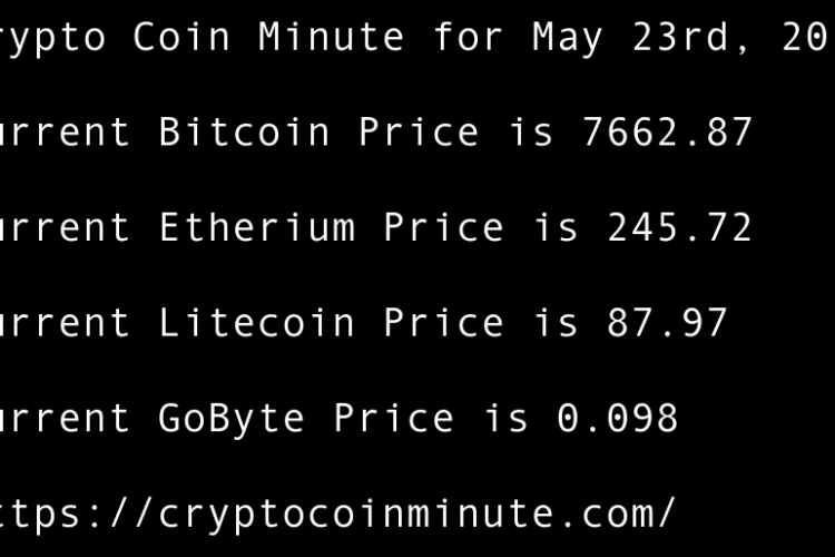 Current Bitcoin Price is 7662.87 Current Etherium Price is 245.72 Current Litecoin Price is 87.97 Current GoByte Price is 0.098