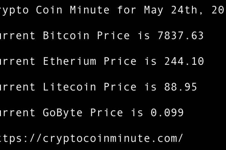 Current Bitcoin Price is 7837.63 Current Etherium Price is 244.10 Current Litecoin Price is 88.95 Current GoByte Price is 0.099