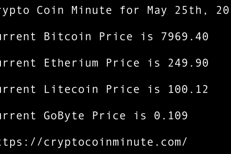 Current Bitcoin Price is 7969.40 Current Etherium Price is 249.90 Current Litecoin Price is 100.12 Current GoByte Price is 0.109