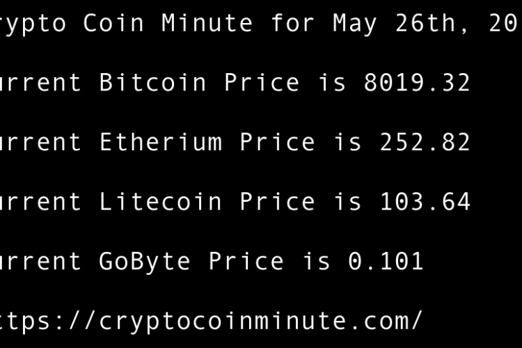 Current Bitcoin Price is 8019.32 Current Etherium Price is 252.82 Current Litecoin Price is 103.64 Current GoByte Price is 0.101