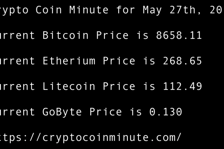 Current Bitcoin Price is 8658.11 Current Etherium Price is 268.65 Current Litecoin Price is 112.49 Current GoByte Price is 0.130