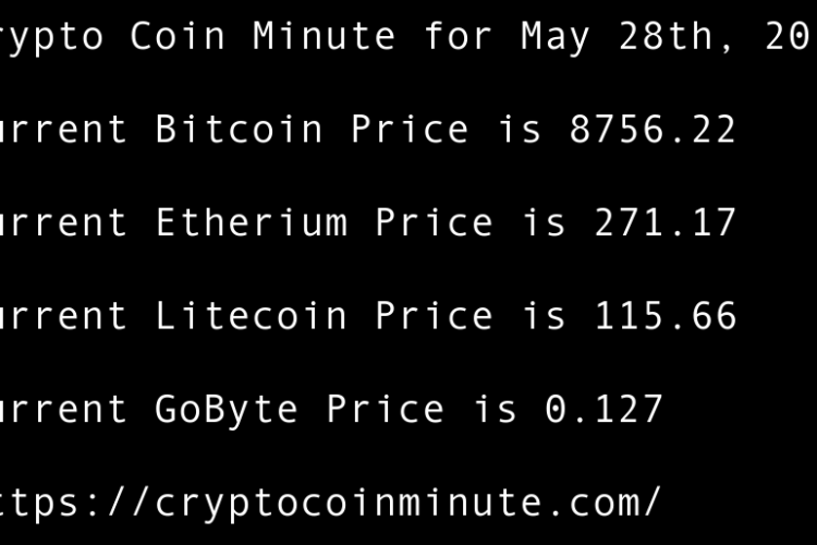 Current Bitcoin Price is 8756.22 Current Etherium Price is 271.17 Current Litecoin Price is 115.66 Current GoByte Price is 0.127