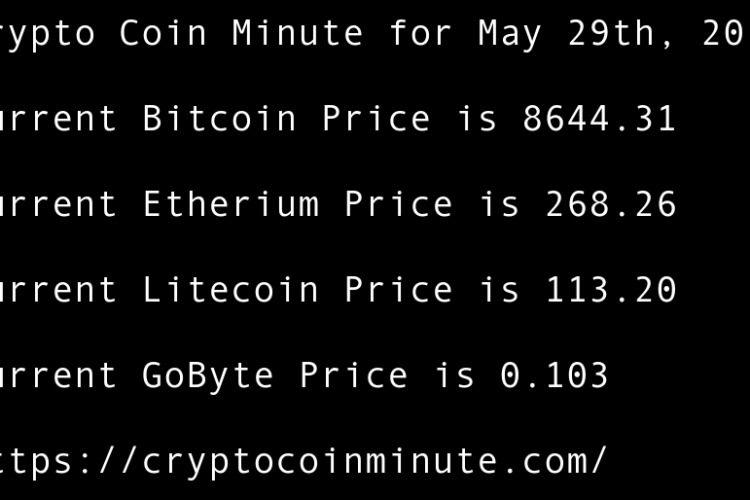 Current Bitcoin Price is 8644.31 Current Etherium Price is 268.26 Current Litecoin Price is 113.20 Current GoByte Price is 0.103