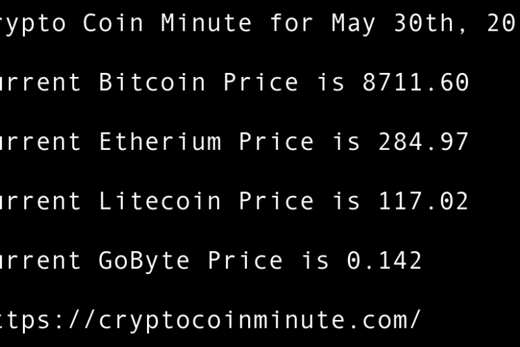 Current Bitcoin Price is 8711.60 Current Etherium Price is 284.97 Current Litecoin Price is 117.02 Current GoByte Price is 0.142