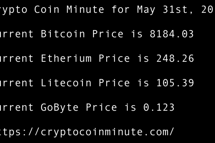 Current Bitcoin Price is 8184.03 Current Etherium Price is 248.26 Current Litecoin Price is 105.39 Current GoByte Price is 0.123