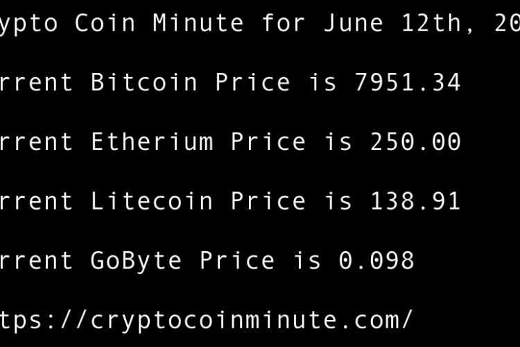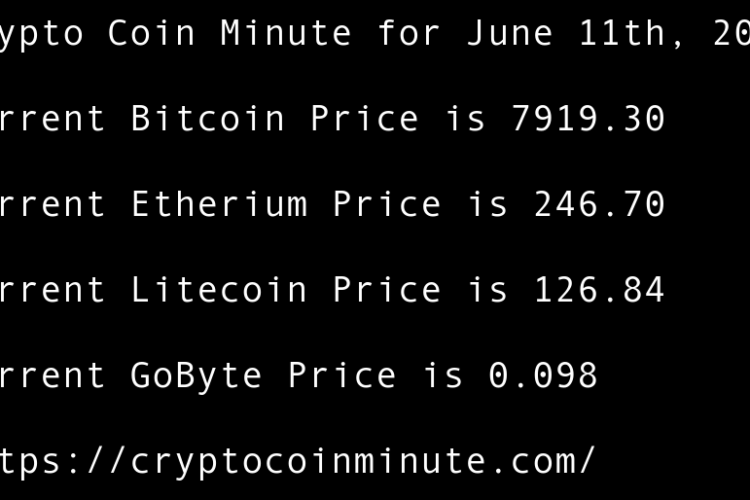 Current Bitcoin Price is 7951.34 Current Etherium Price is 250.00 Current Litecoin Price is 138.91 Current GoByte Price is 0.098