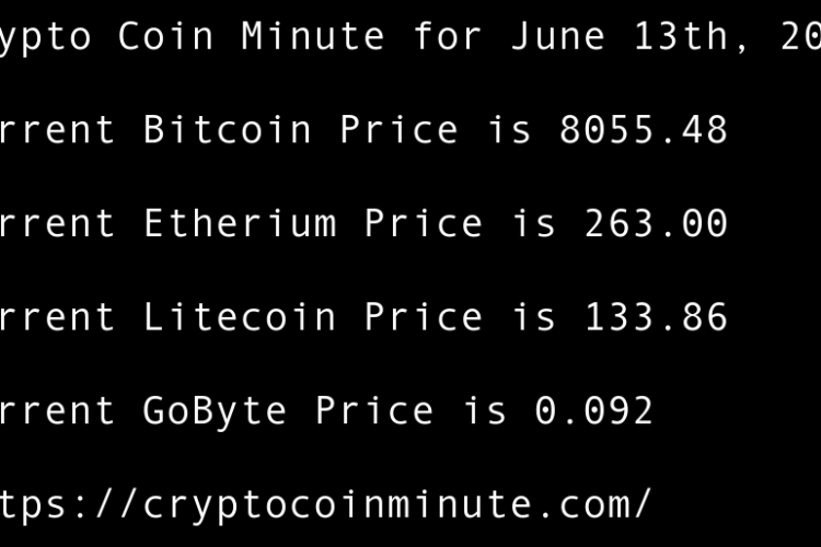 Current Bitcoin Price is 8055.48 Current Etherium Price is 263.00 Current Litecoin Price is 133.86 Current GoByte Price is 0.092