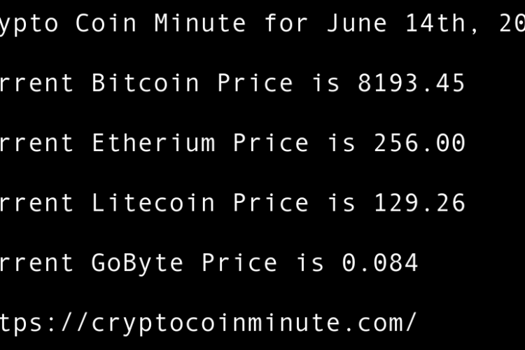 Current Bitcoin Price is 8193.45 Current Etherium Price is 256.00 Current Litecoin Price is 129.26 Current GoByte Price is 0.084