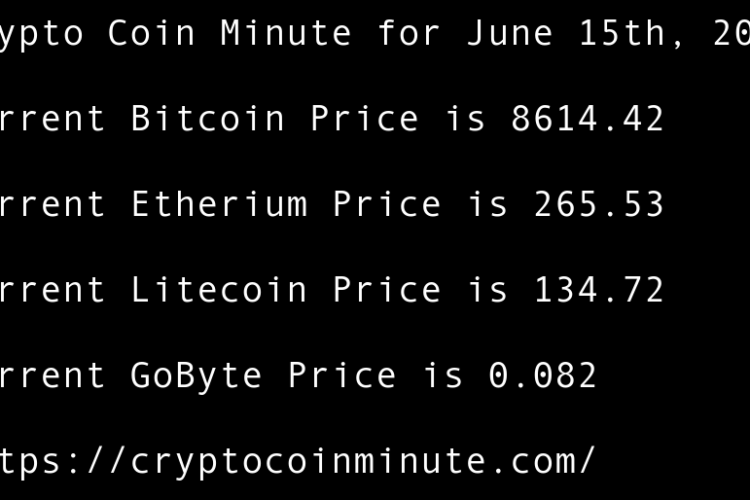 Current Bitcoin Price is 8614.42 Current Etherium Price is 265.53 Current Litecoin Price is 134.72 Current GoByte Price is 0.082