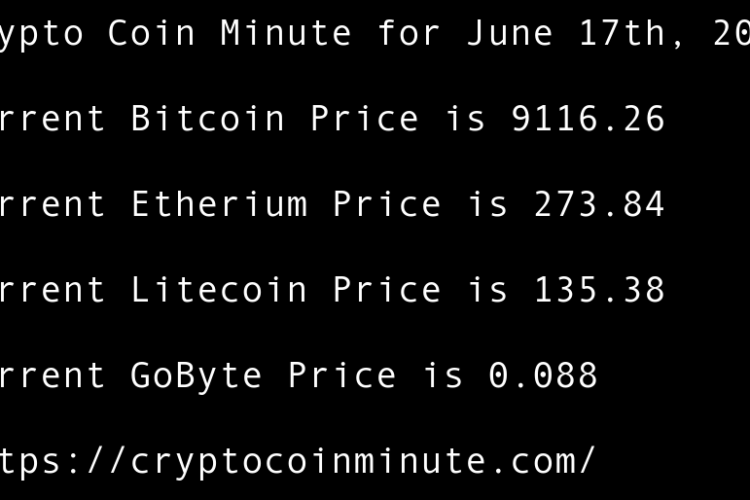 Current Bitcoin Price is 9116.26 Current Etherium Price is 273.84 Current Litecoin Price is 135.38 Current GoByte Price is 0.088