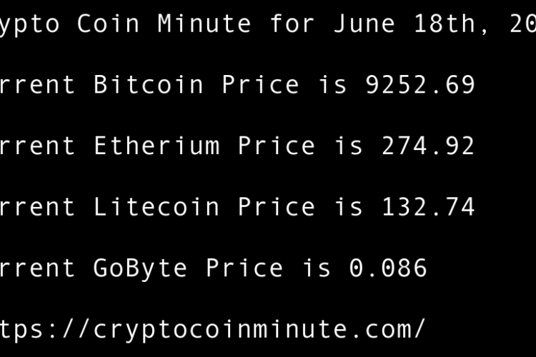 Current Bitcoin Price is 9252.69 Current Etherium Price is 274.92 Current Litecoin Price is 132.74 Current GoByte Price is 0.086