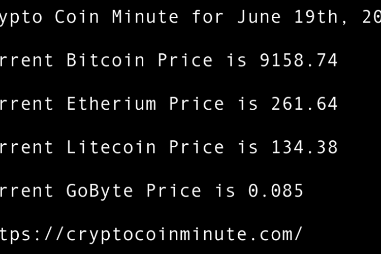 Current Bitcoin Price is 9158.74 Current Etherium Price is 261.64 Current Litecoin Price is 134.38 Current GoByte Price is 0.085