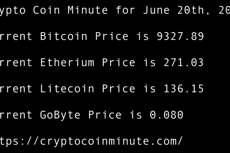 Current Bitcoin Price is 9327.89 Current Etherium Price is 271.03 Current Litecoin Price is 136.15 Current GoByte Price is 0.080