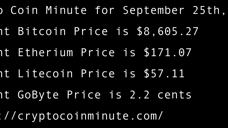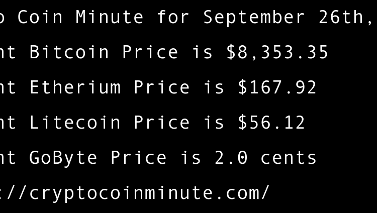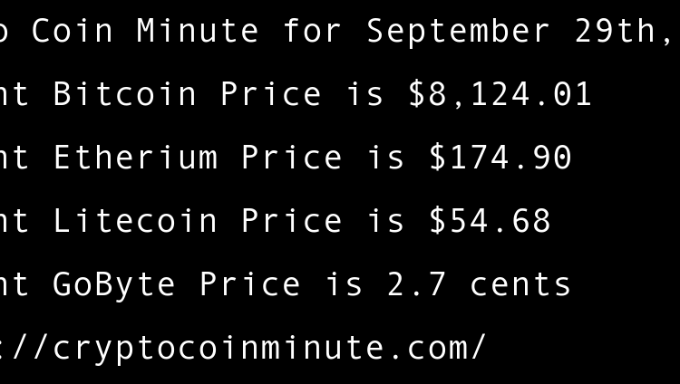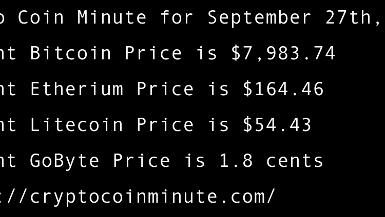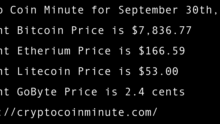 Current Bitcoin Price is $7,836.77 Current Etherium Price is $166.59 Current Litecoin Price is $53.00 Current GoByte Price is 2.4 cents Asian Institutions Are Finally Warming to Crypto Hedge Funds Bitrefill bets big on Bitcoin Lightning Network, becomes one of the largest node operators Bitcoins …