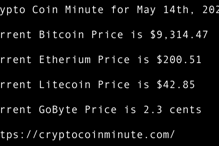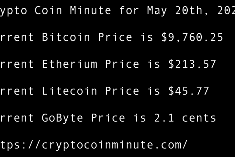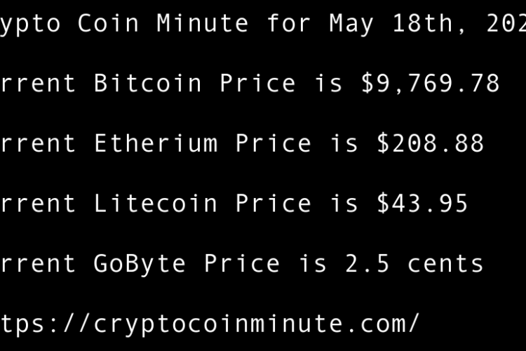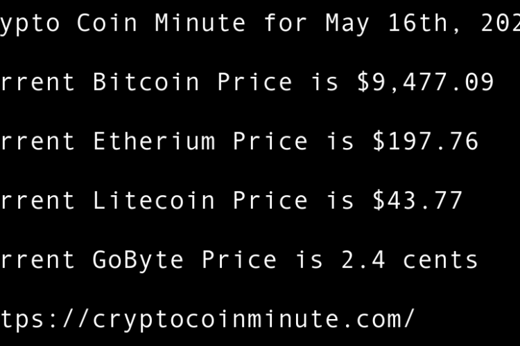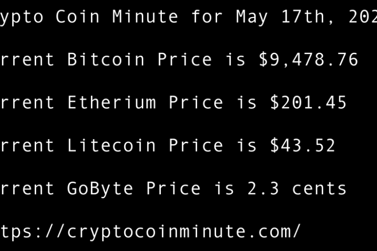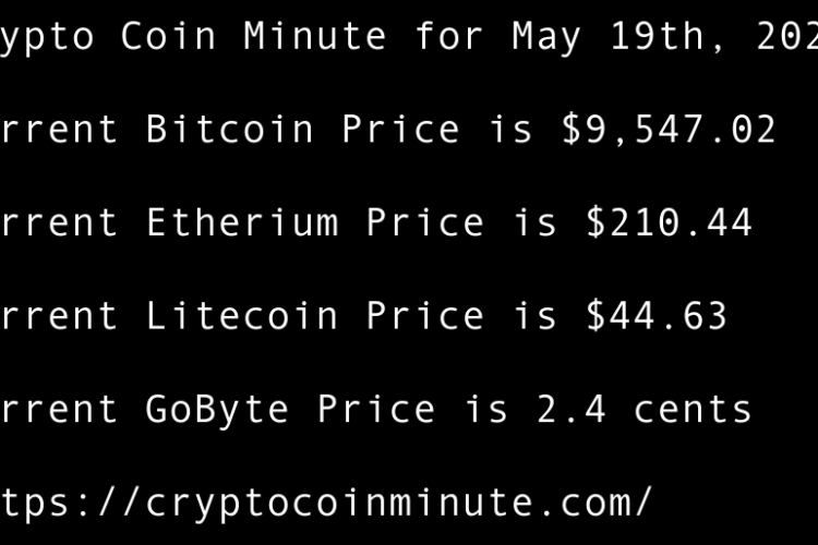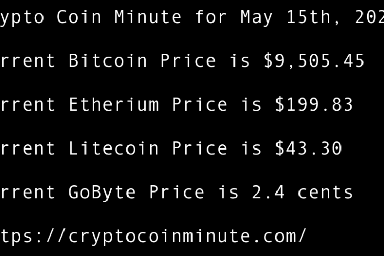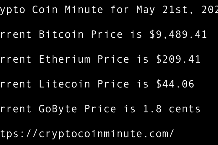 Current Bitcoin Price is $9,489.41 Current Etherium Price is $209.41 Current Litecoin Price is $44.06 Current GoByte Price is 1.8 cents Bitcoin Rebounds to $9,500 After Scary Sell-off US Lawmaker Proposes Legislative Groundwork for National Blockchain Strategy Adam Back Thinks Recent Bitcoin Move Wasn’t Satoshi …