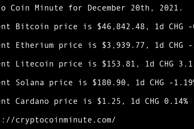 Current Bitcoin price is $46,842.48, 1d CHG -0.27% Current Etherium price is $3,939.77, 1d CHG -1.00% Current Litecoin price is $153.81, 1d CHG 3.11% Current Solana price is $180.90, 1d CHG -1.19% Current Cardano price is $1.25, 1d CHG 0.14% Up by 43%, Avalanche may …