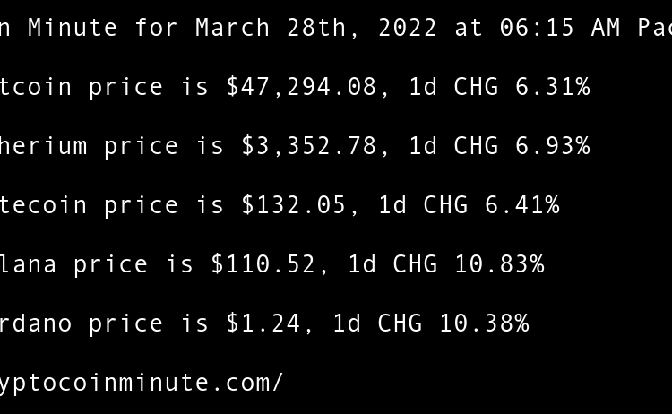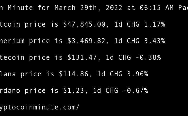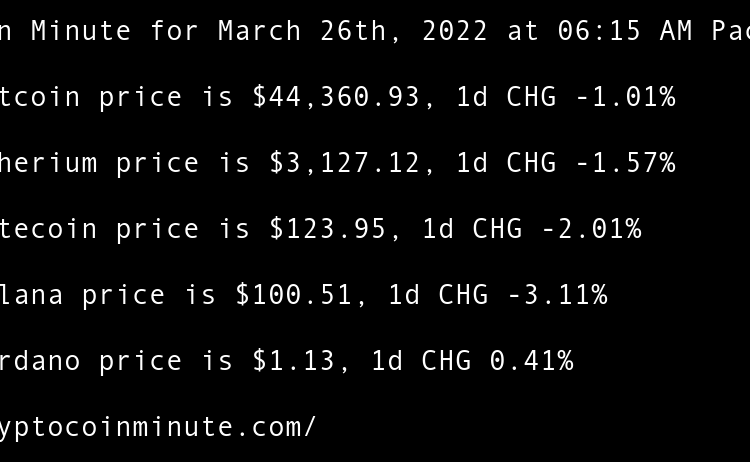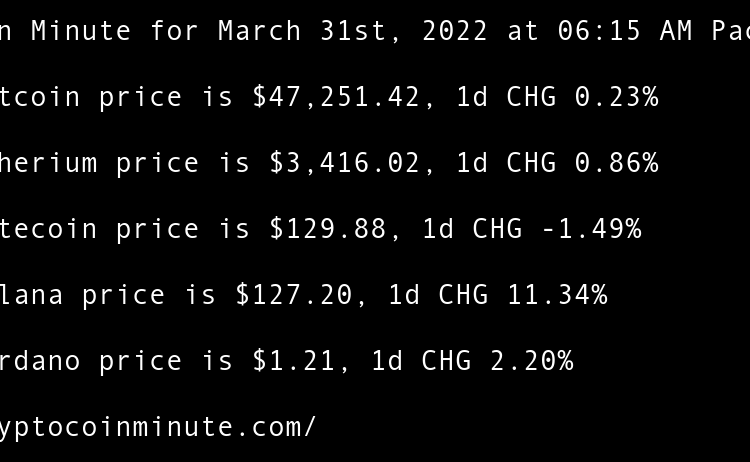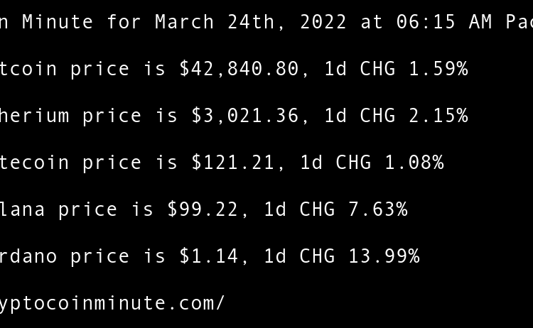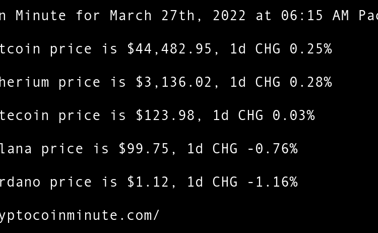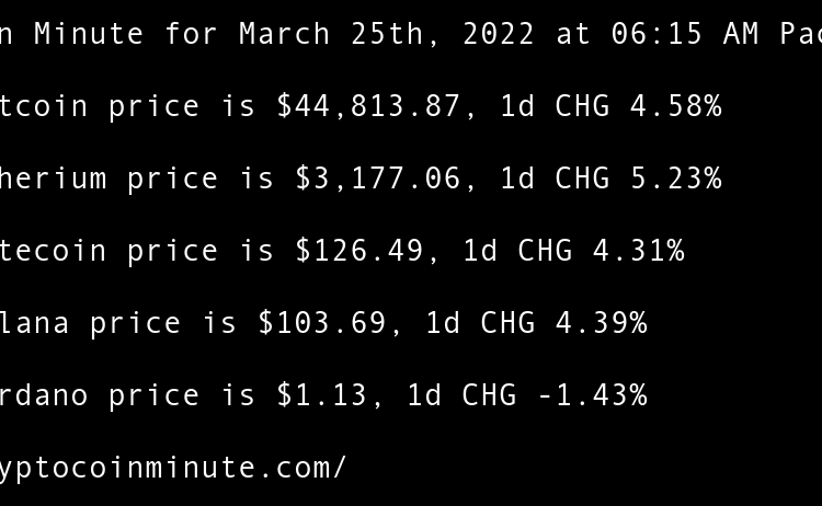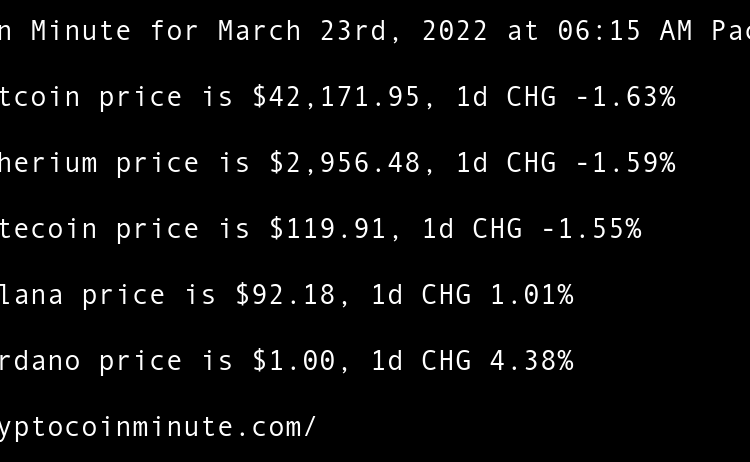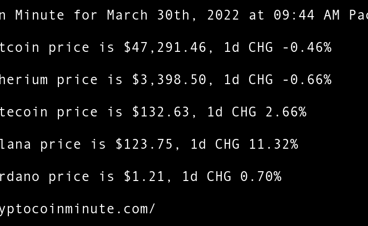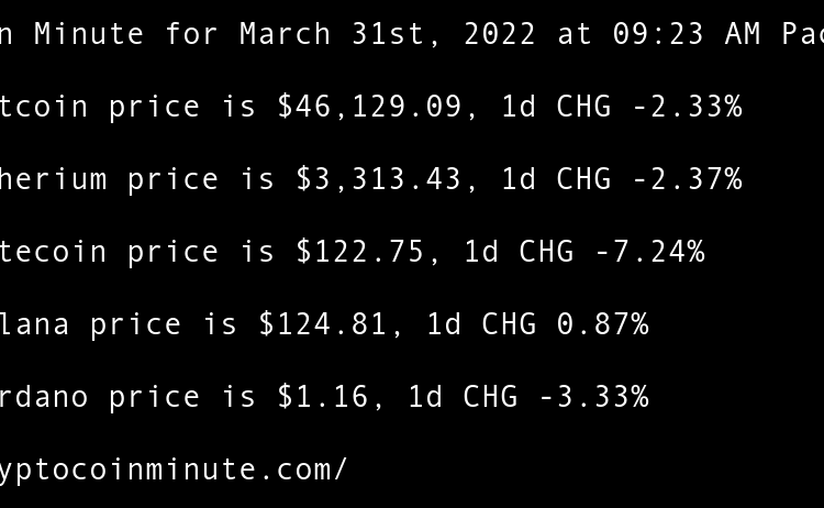 Current Bitcoin price is $46,129.09, 1d CHG -2.33% Current Etherium price is $3,313.43, 1d CHG -2.37% Current Litecoin price is $122.75, 1d CHG -7.24% Current Solana price is $124.81, 1d CHG 0.87% Current Cardano price is $1.16, 1d CHG -3.33% Leading Derivatives Exchange CME Group …