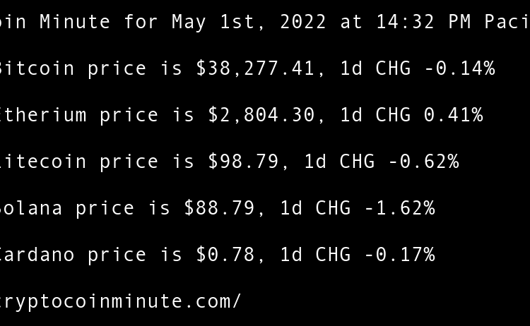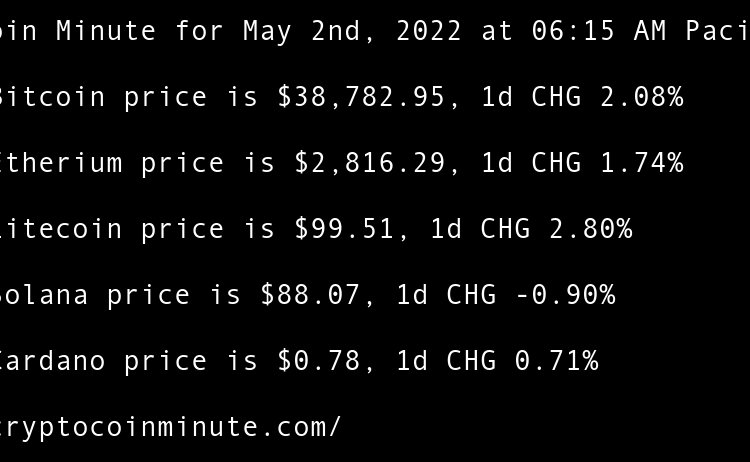 Current Bitcoin price is $38,782.95, 1d CHG 2.08% Current Etherium price is $2,816.29, 1d CHG 1.74% Current Litecoin price is $99.51, 1d CHG 2.80% Current Solana price is $88.07, 1d CHG -0.90% Current Cardano price is $0.78, 1d CHG 0.71% Elon Musk, Mark Cuban Discuss …