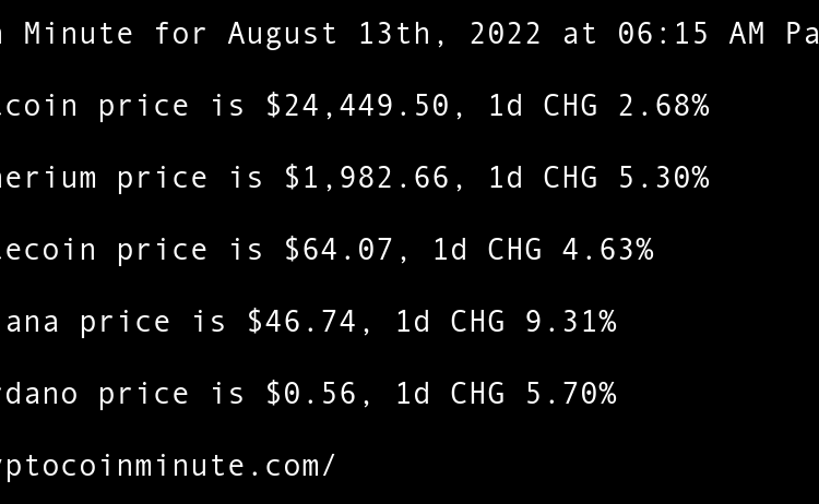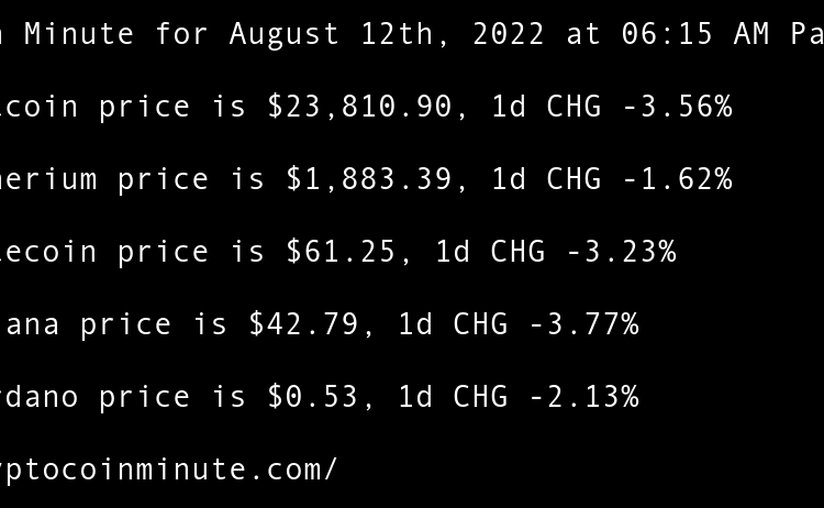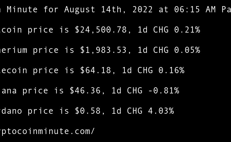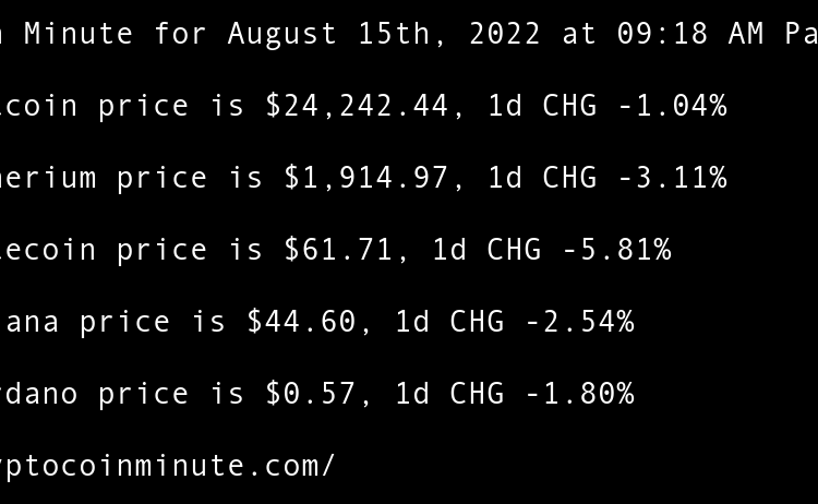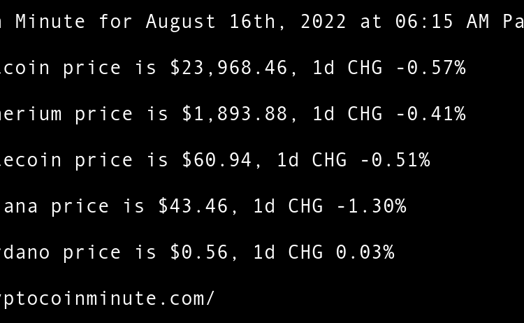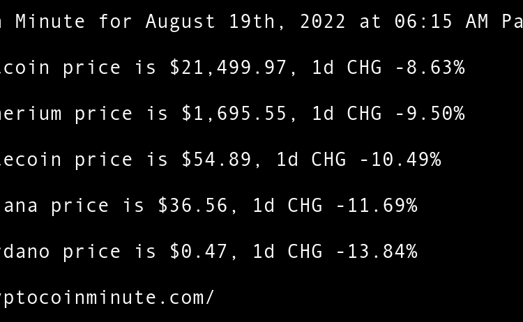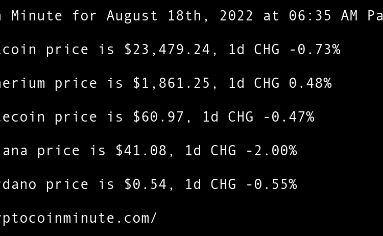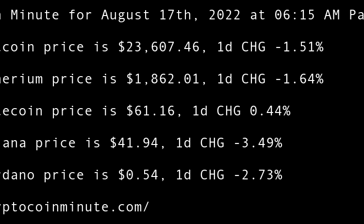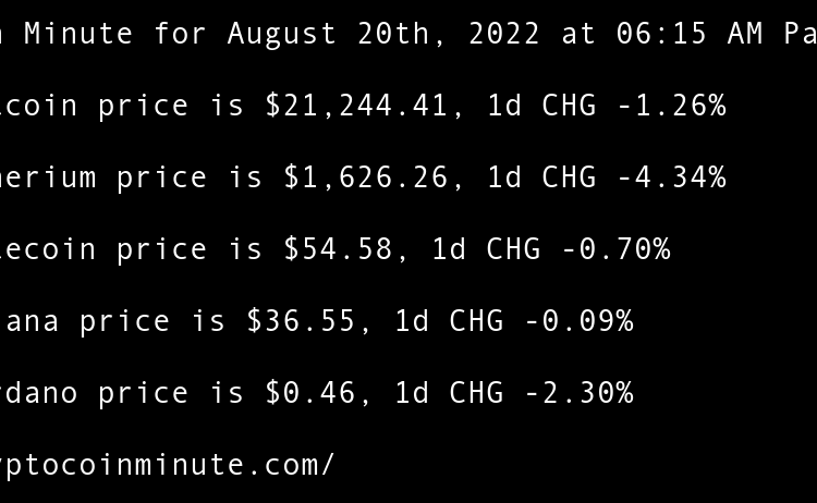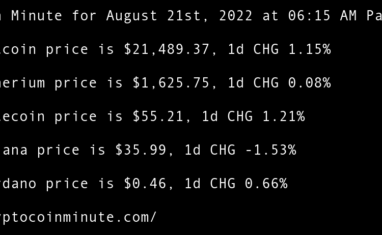 Current Bitcoin price is $21,489.37, 1d CHG 1.15% Current Etherium price is $1,625.75, 1d CHG 0.08% Current Litecoin price is $55.21, 1d CHG 1.21% Current Solana price is $35.99, 1d CHG -1.53% Current Cardano price is $0.46, 1d CHG 0.66% Ethereum All-Core Developer meeting calms …