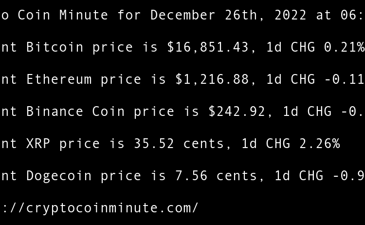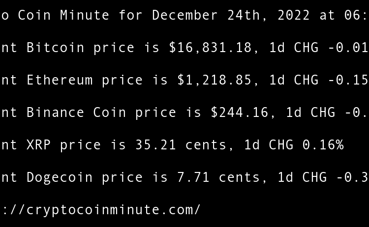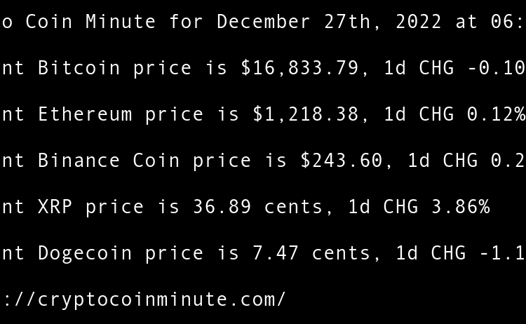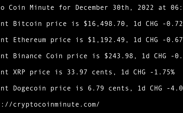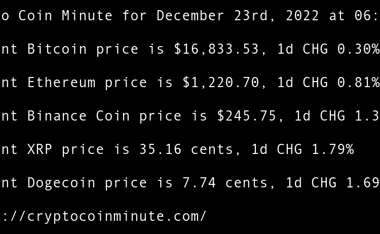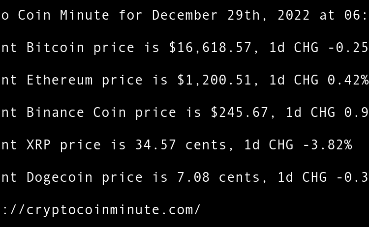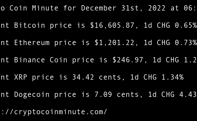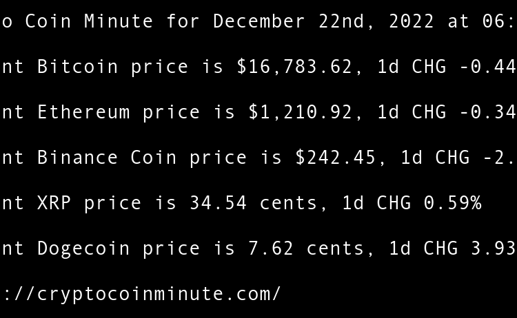 Current Bitcoin price is $16,605.87, 1d CHG 0.65% Current Ethereum price is $1,201.22, 1d CHG 0.73% Current Binance Coin price is $246.97, 1d CHG 1.23% Current XRP price is 34.42 cents, 1d CHG 1.34% Current Dogecoin price is 7.09 cents, 1d CHG 4.43% FTX Debtors …