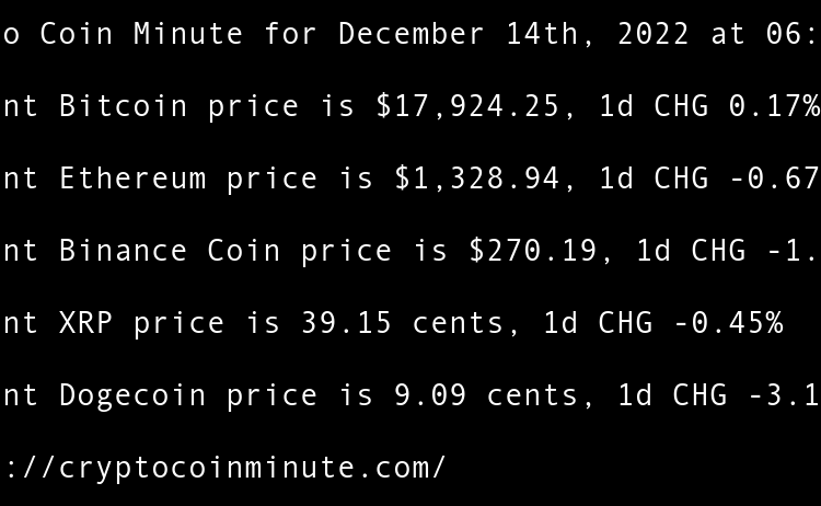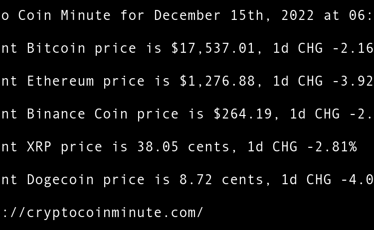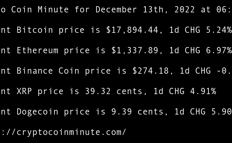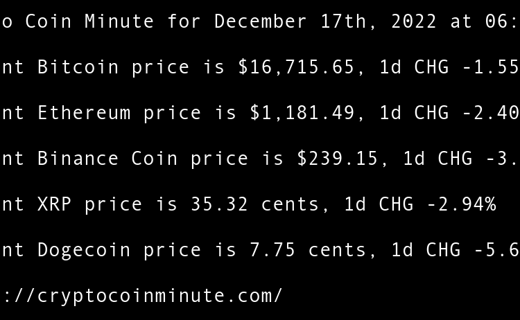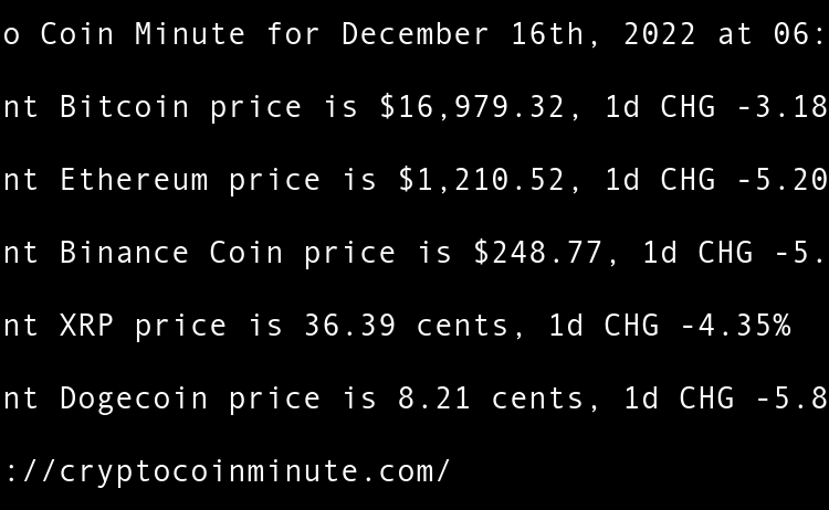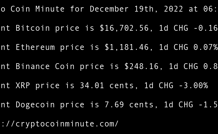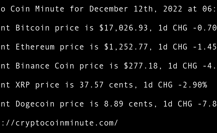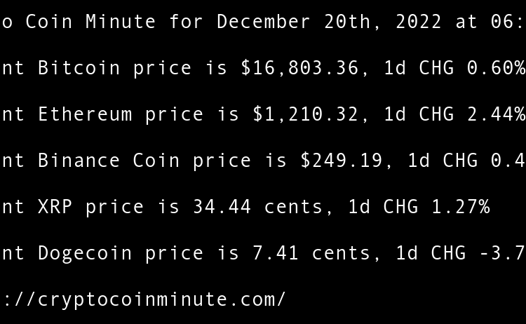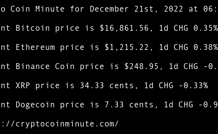 Current Bitcoin price is $16,861.56, 1d CHG 0.35% Current Ethereum price is $1,215.22, 1d CHG 0.38% Current Binance Coin price is $248.95, 1d CHG -0.10% Current XRP price is 34.33 cents, 1d CHG -0.33% Current Dogecoin price is 7.33 cents, 1d CHG -0.99% FTXs SBF …