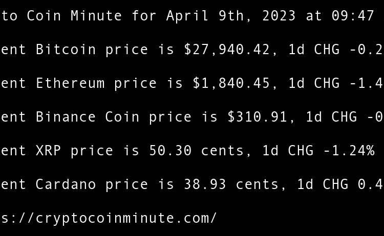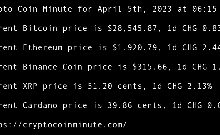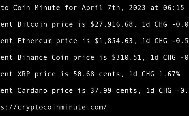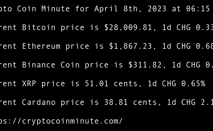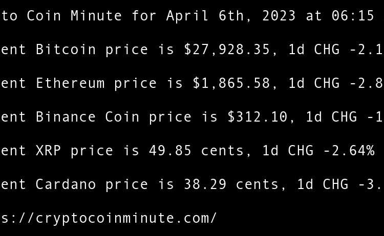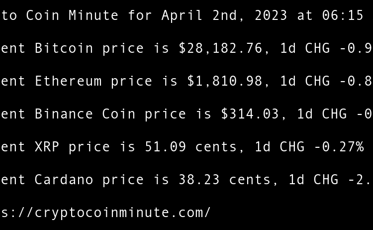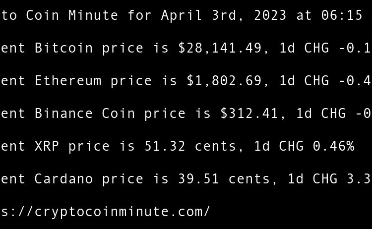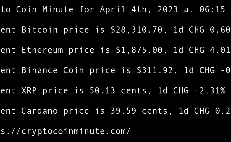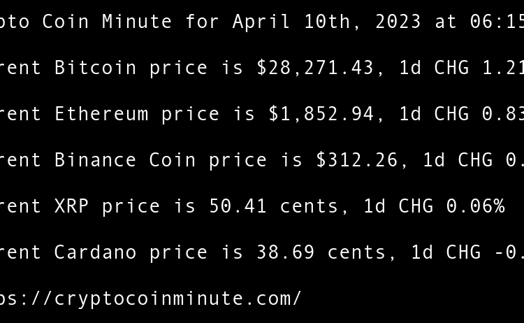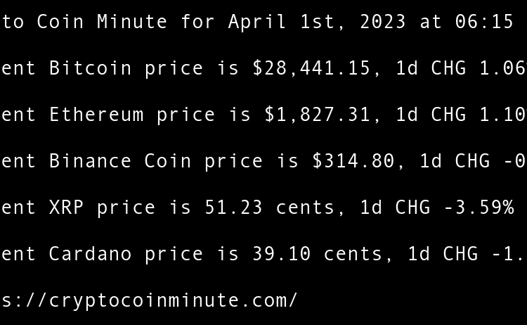 Current Bitcoin price is $28,271.43, 1d CHG 1.21% Current Ethereum price is $1,852.94, 1d CHG 0.83% Current Binance Coin price is $312.26, 1d CHG 0.45% Current XRP price is 50.41 cents, 1d CHG 0.06% Current Cardano price is 38.69 cents, 1d CHG -0.67% Texas lawmakers …