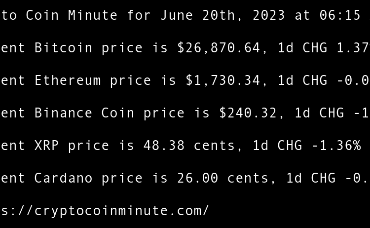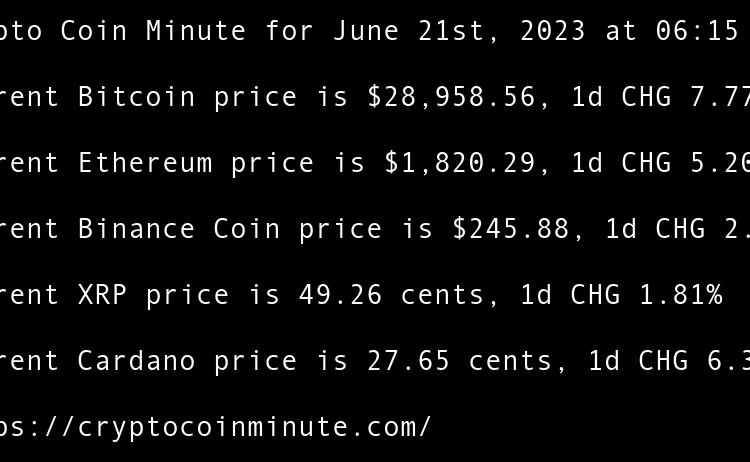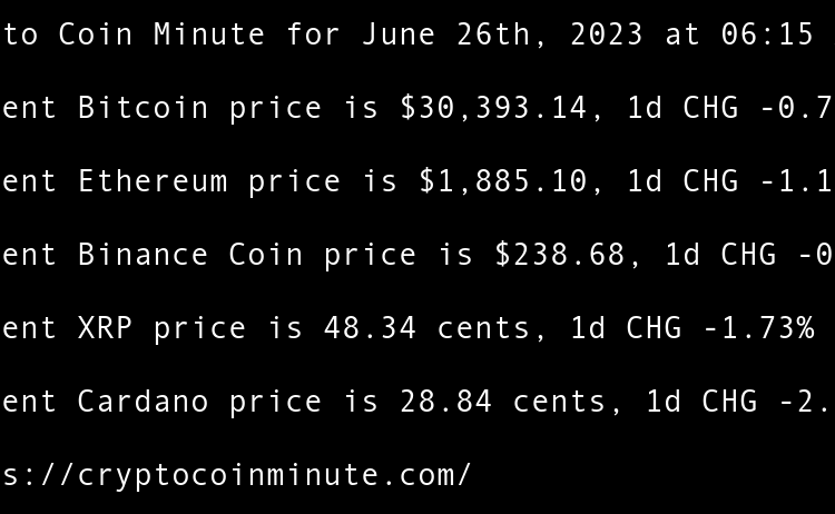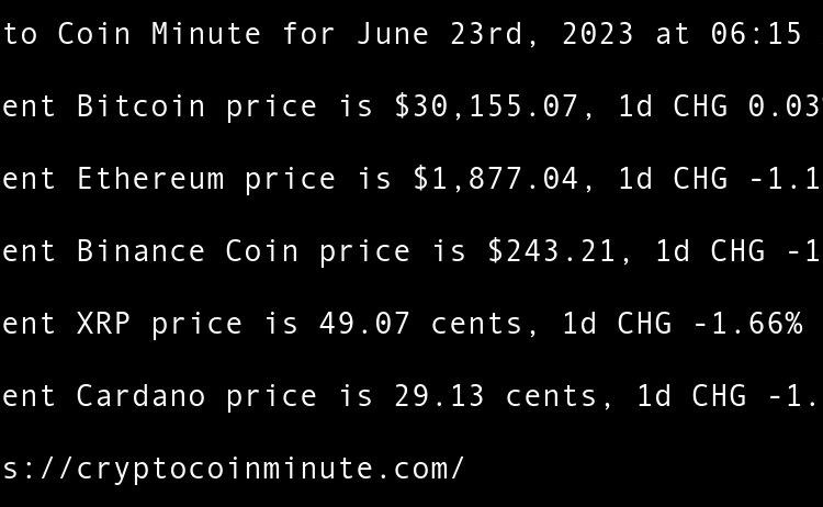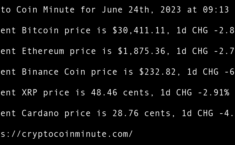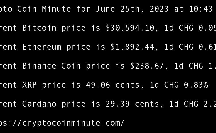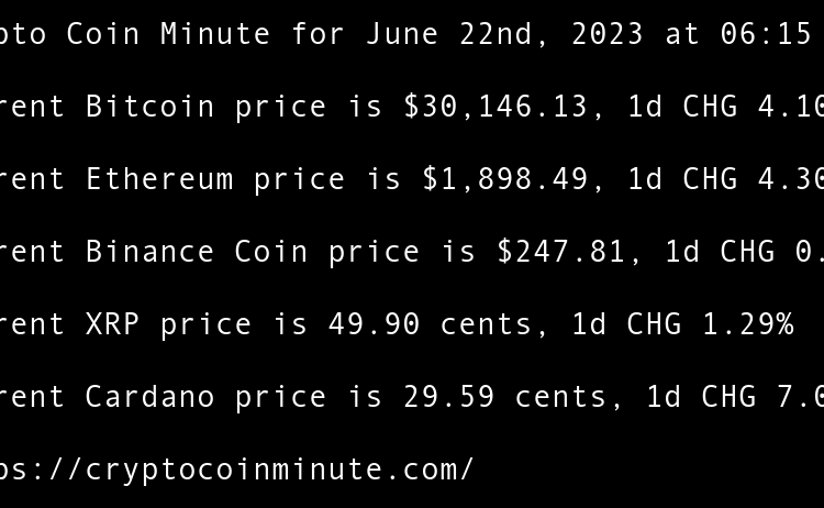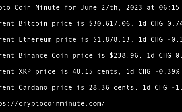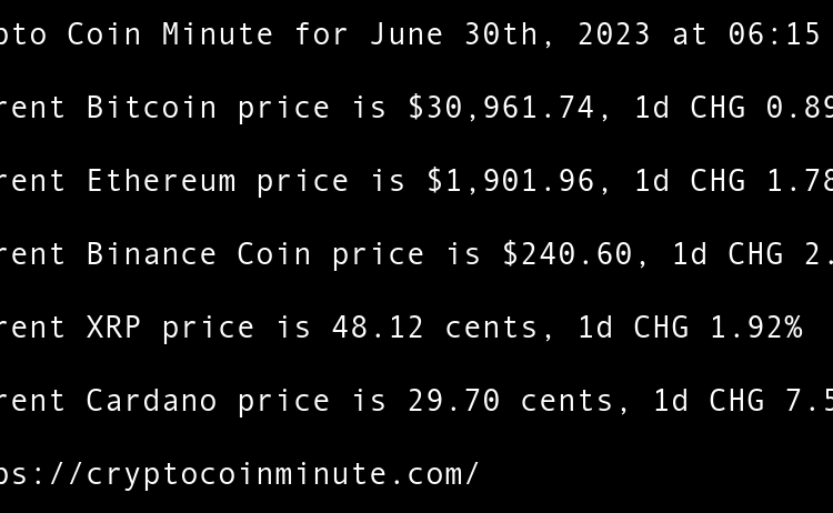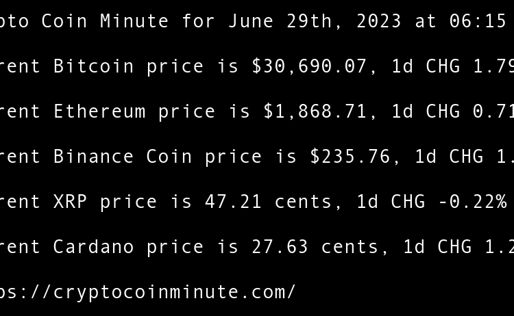 Current Bitcoin price is $30,961.74, 1d CHG 0.89% Current Ethereum price is $1,901.96, 1d CHG 1.78% Current Binance Coin price is $240.60, 1d CHG 2.05% Current XRP price is 48.12 cents, 1d CHG 1.92% Current Cardano price is 29.70 cents, 1d CHG 7.51% Mastercards MTN …