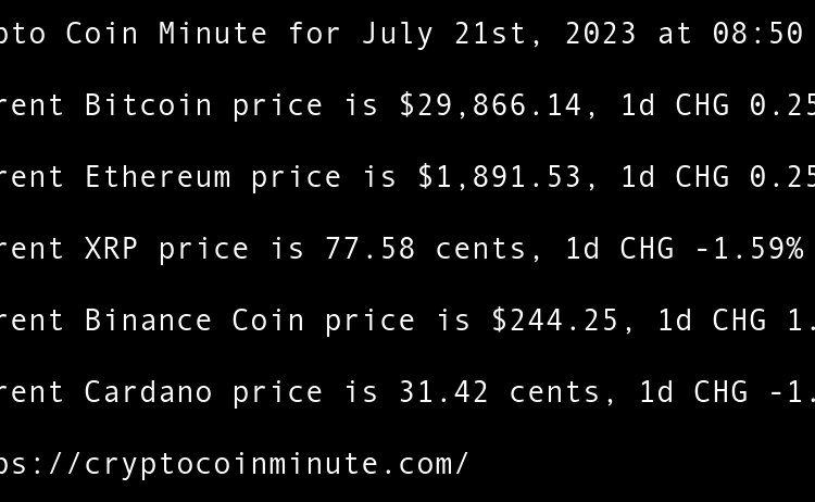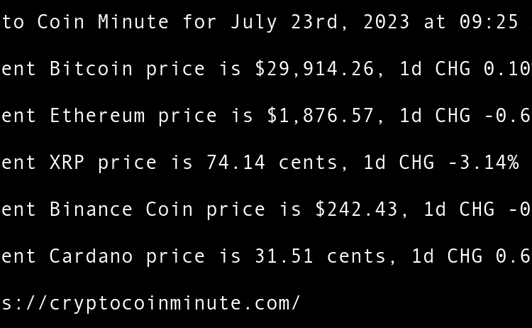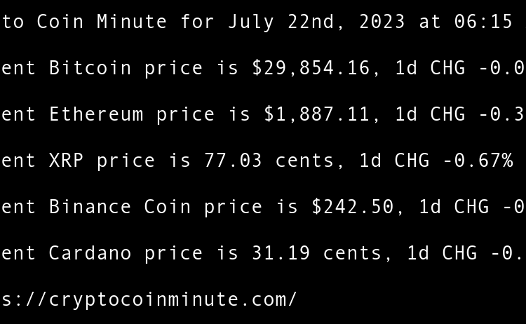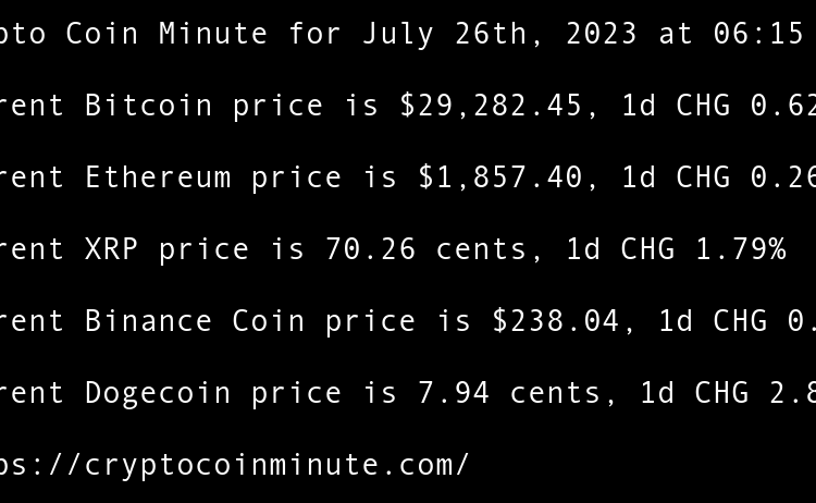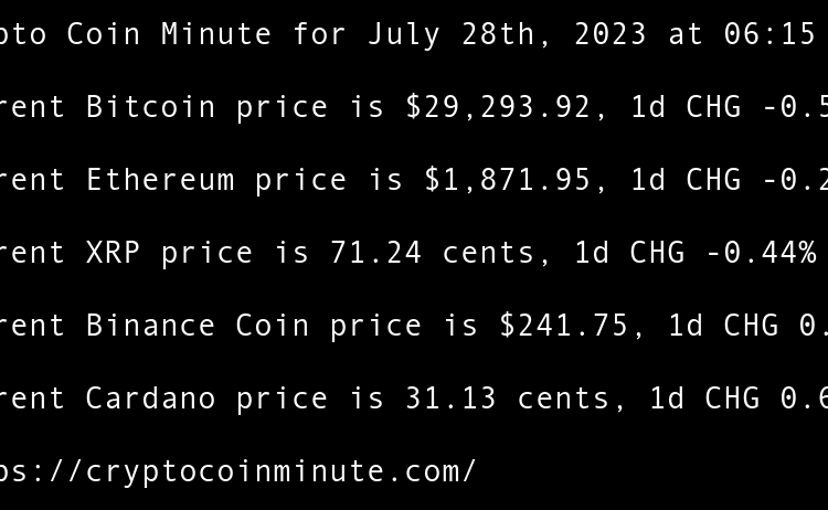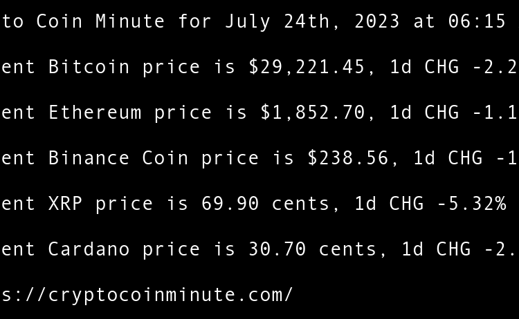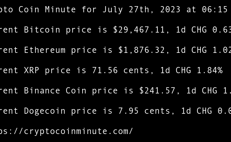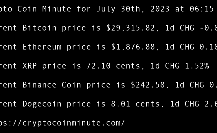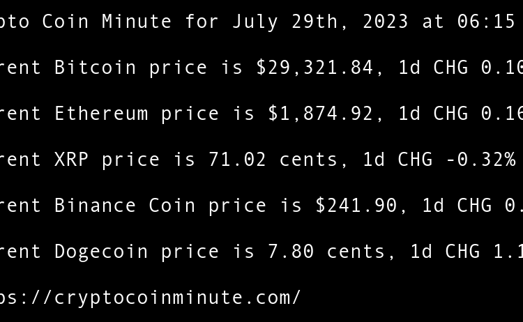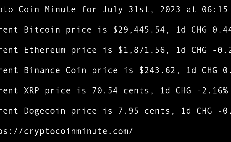 Current Bitcoin price is $29,445.54, 1d CHG 0.44% Current Ethereum price is $1,871.56, 1d CHG -0.28% Current Binance Coin price is $243.62, 1d CHG 0.43% Current XRP price is 70.54 cents, 1d CHG -2.16% Current Dogecoin price is 7.95 cents, 1d CHG -0.78% Breaking: Binance …