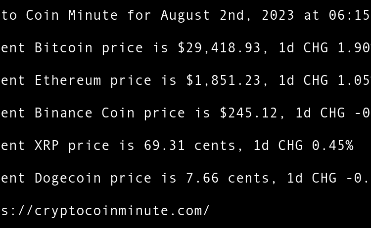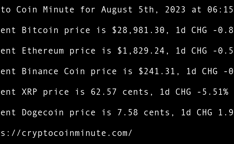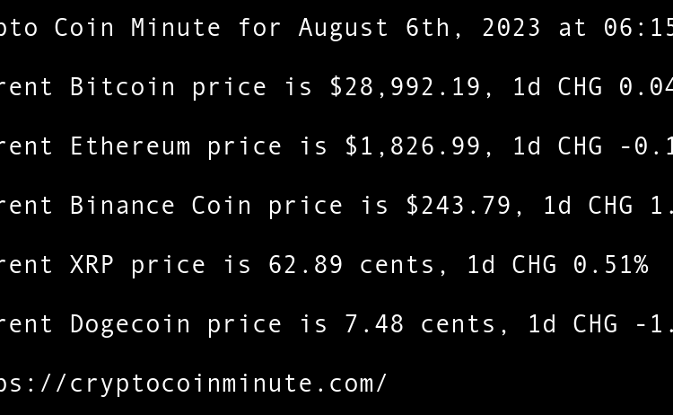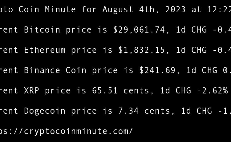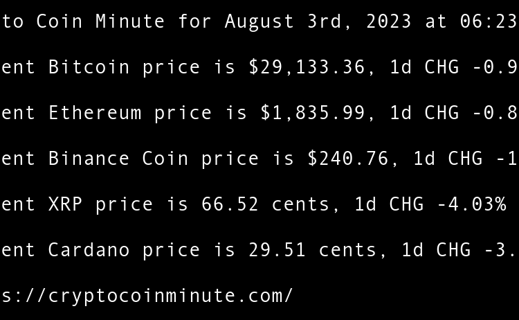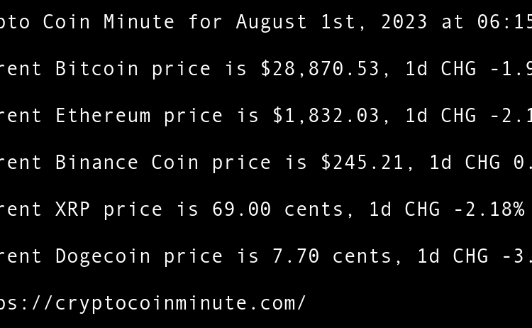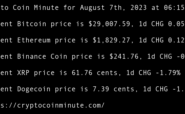 Current Bitcoin price is $29,007.59, 1d CHG 0.05% Current Ethereum price is $1,829.27, 1d CHG 0.12% Current Binance Coin price is $241.76, 1d CHG -0.83% Current XRP price is 61.76 cents, 1d CHG -1.79% Current Dogecoin price is 7.39 cents, 1d CHG -1.11% G20 President …