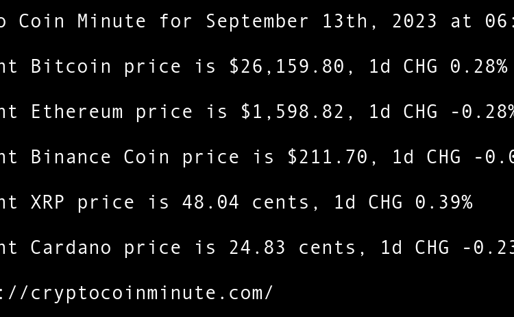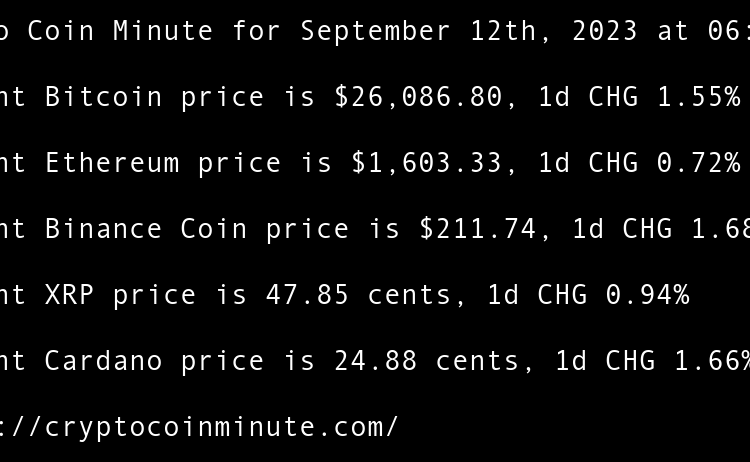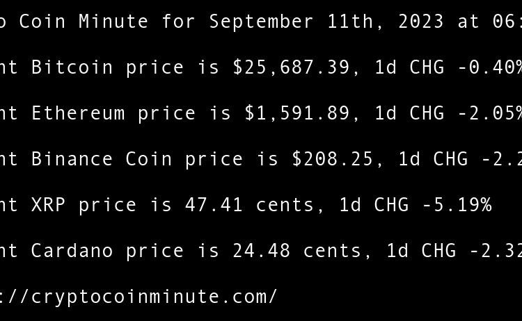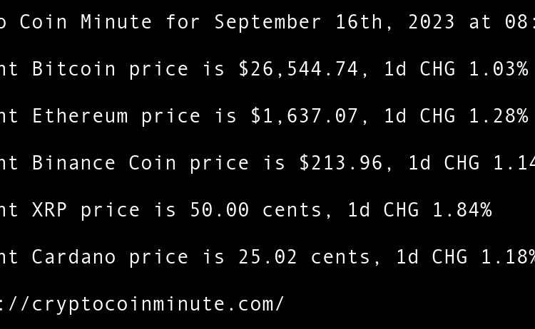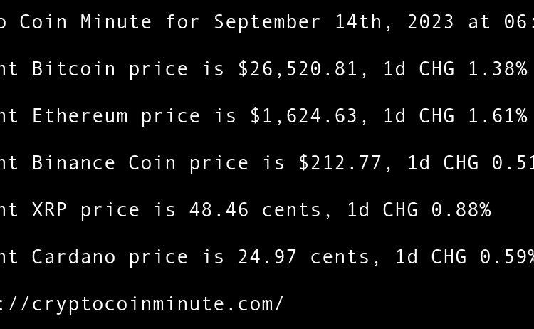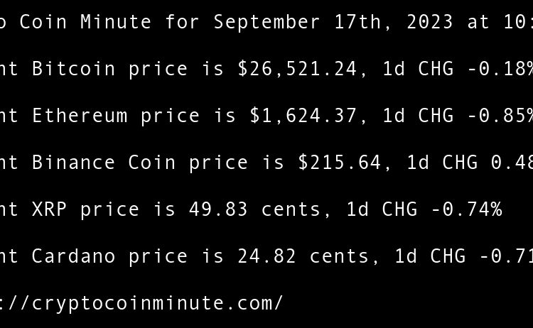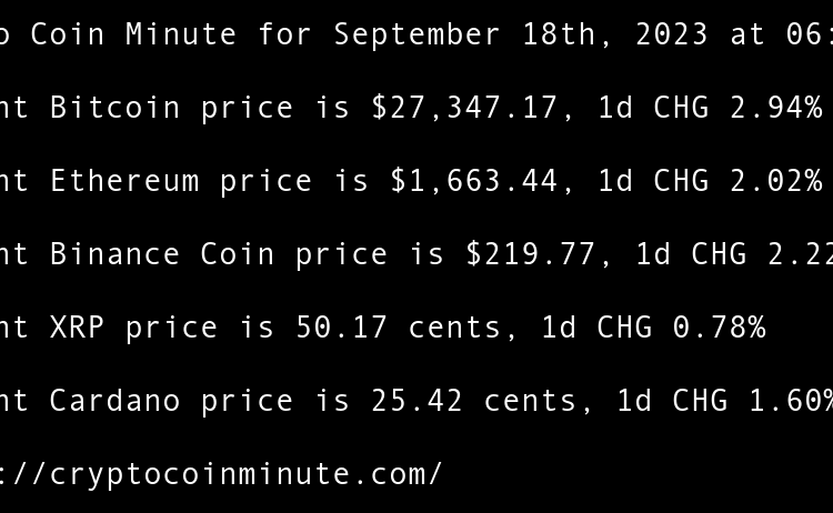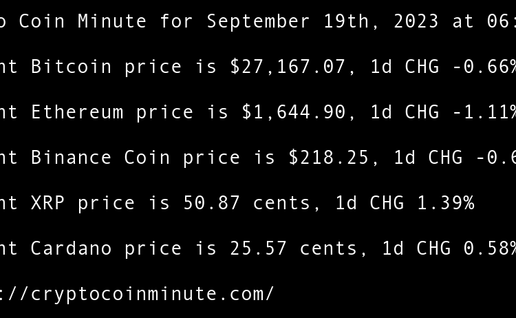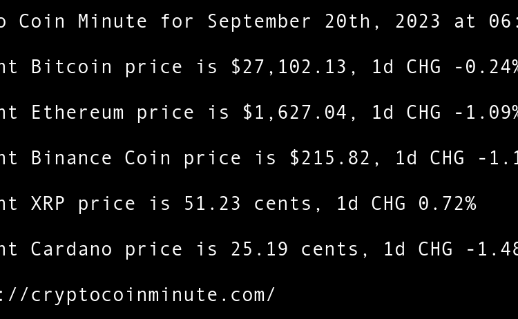 Current Bitcoin price is $27,102.13, 1d CHG -0.24% Current Ethereum price is $1,627.04, 1d CHG -1.09% Current Binance Coin price is $215.82, 1d CHG -1.11% Current XRP price is 51.23 cents, 1d CHG 0.72% Current Cardano price is 25.19 cents, 1d CHG -1.48% Hong Kong …