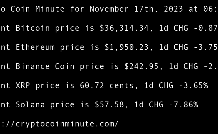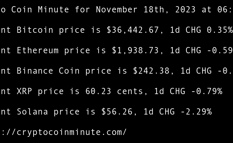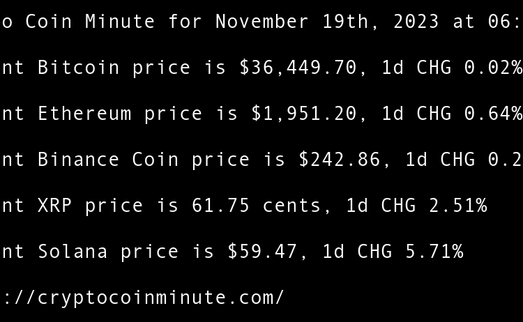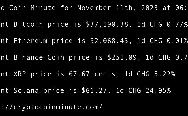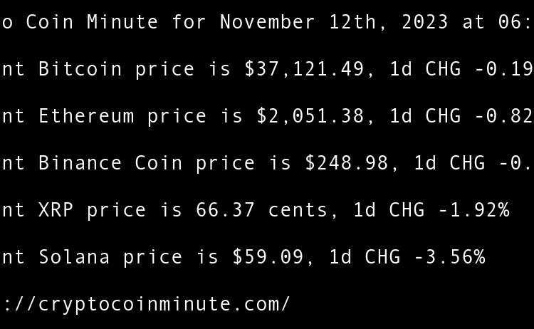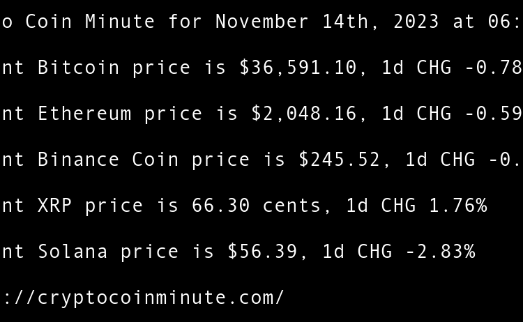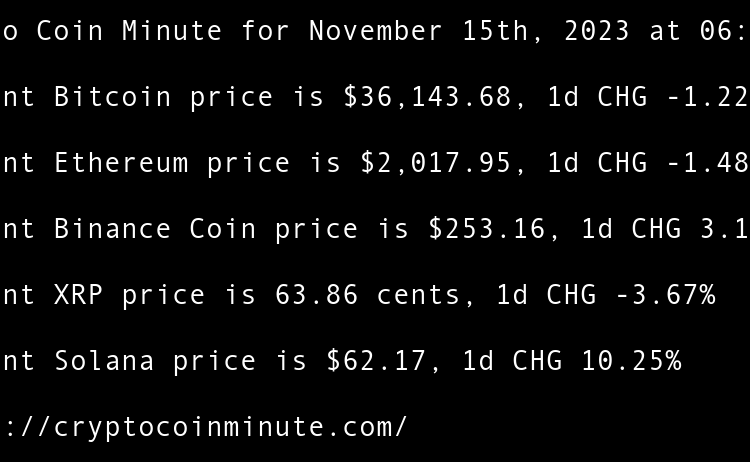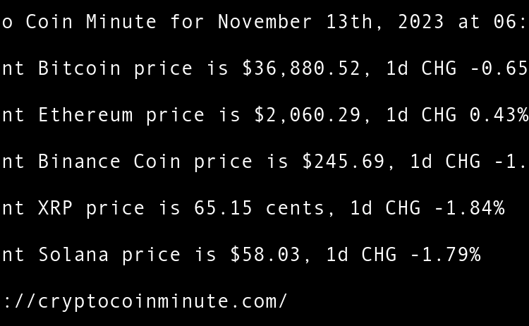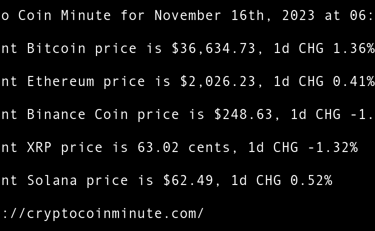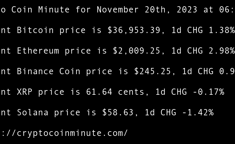 Current Bitcoin price is $36,953.39, 1d CHG 1.38% Current Ethereum price is $2,009.25, 1d CHG 2.98% Current Binance Coin price is $245.25, 1d CHG 0.99% Current XRP price is 61.64 cents, 1d CHG -0.17% Current Solana price is $58.63, 1d CHG -1.42% BTC Price Jumps …
