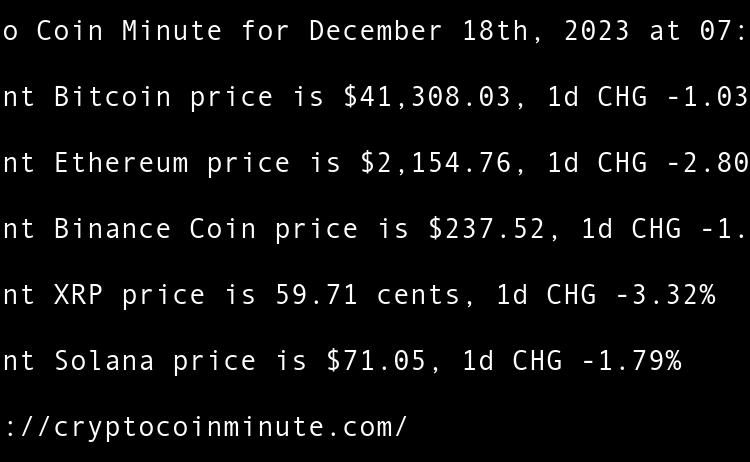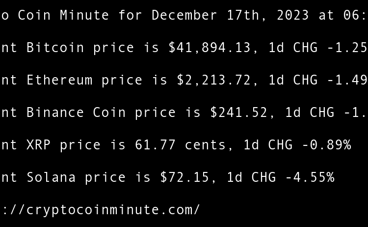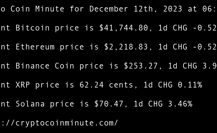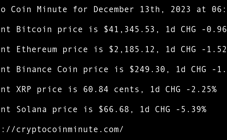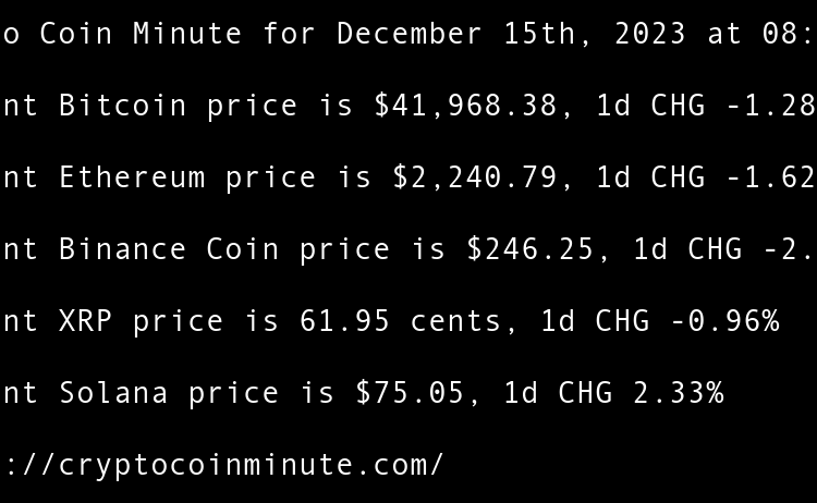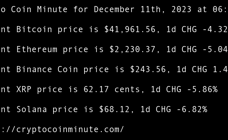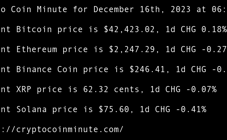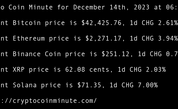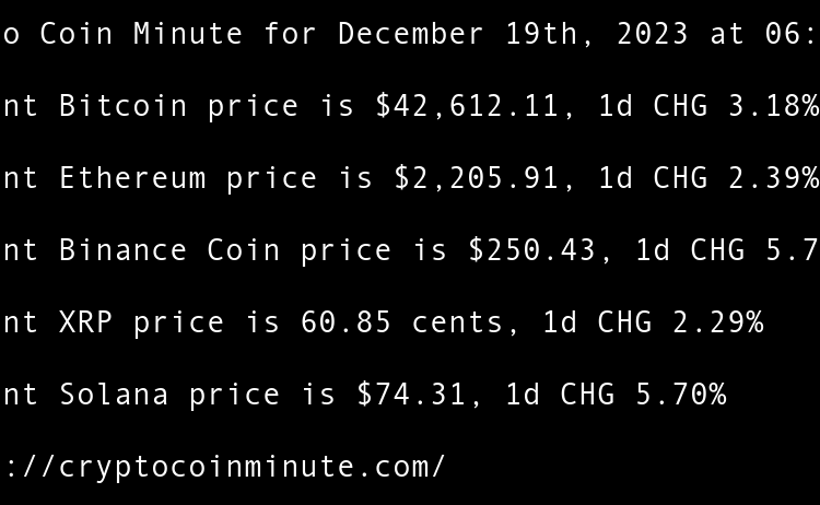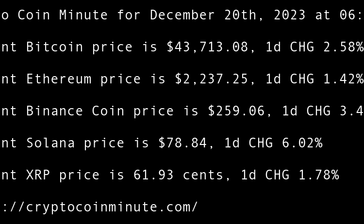 Current Bitcoin price is $43,713.08, 1d CHG 2.58% Current Ethereum price is $2,237.25, 1d CHG 1.42% Current Binance Coin price is $259.06, 1d CHG 3.45% Current Solana price is $78.84, 1d CHG 6.02% Current XRP price is 61.93 cents, 1d CHG 1.78% Spot Bitcoin ETFs …
