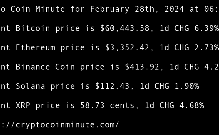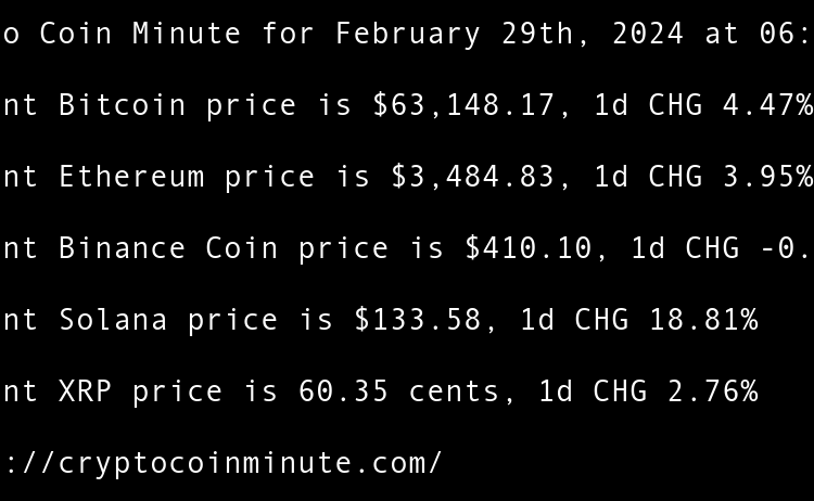 Current Bitcoin price is $63,148.17, 1d CHG 4.47% Current Ethereum price is $3,484.83, 1d CHG 3.95% Current Binance Coin price is $410.10, 1d CHG -0.92% Current Solana price is $133.58, 1d CHG 18.81% Current XRP price is 60.35 cents, 1d CHG 2.76% CBN Reports $26 …